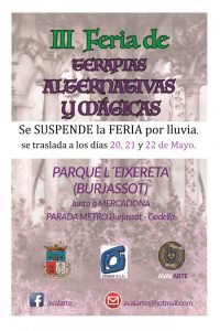 La III Feria de Terapias Alternativas y Mágicas, organizada por la Asociación de Artesanos de Burjassot (AVALARTE) y celebrada en el Parque de l’Eixereta, se ha aplazado dado que las previsiones meteorológicas han dado una alta probabilidad de lluvias a lo largo de todo el fin de semana. Así, tal y como han informado desde la […]