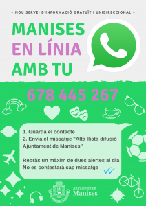 L'Ajuntament de Manises, amb l'objectiu de millorar la comunicació amb la ciutadana, posa en marxa el servei d'informació gratuïta per WhatsApp ‘Manises, en línia amb tu’. Amb aquesta aplicació de missatgeria instantània els manisers i maniseres podran accedir de manera ràpida i sense cap tipus de cost a la informació d'interés del municipi: avisos, edictes, […]