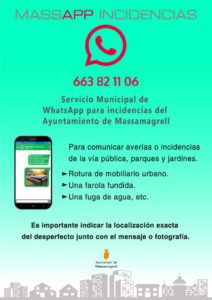 El Ayuntamiento de Massamagrell ha puesto en marcha MassApp Incidencias, una nueva vía de comunicación con los vecinos y vecinas del municipio para atender las averías o incidencias de la vía pública, parques y jardines como roturas del mobiliario urbano, farolas fundidas, fugas de agua, etc. La ciudadanía del municipio podrá enviar vía WhatsApp al […]