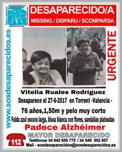 La Guardia Civil ha solicitado la colaboración para dar con el paradero de una mujer de unos 76 años que ha desaparecido en Torrent. La alerta también ha sido activada en la cuenta de twitter de SOS Desparecidos. Según los datos facilitados, Vitelia Ruales Rodríguez, que es como se llama la desaparecida, viste falda azul […]