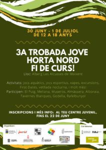 8 municipis de l’Horta Nord celebren la 3a Trobada Jove de l’Horta Nord, l'última d'aquest curs escolar. La Trobada reunirà entre 80 i 100 joves d'Alboraia, Almàssera, El Puig, Godella, Meliana, Museros, Rafelbunyol i Tavernes Blanques, i serà el cap de setmana del 30 de juny i l'1 de juliol a l'Alberg Les Alcusses de Moixent. Hi haurà activitats aquàtiques, […]