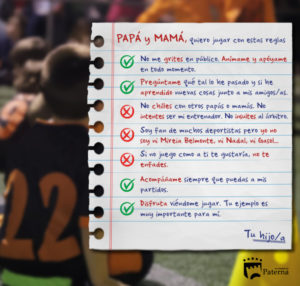 El Ayuntamiento de Paterna, ha lanzado una campaña para concienciar a padres y madres sobre la importancia de defender el juego limpio en las actividades deportivas infantiles. La imagen de la campaña incluye una lista de ‘reglas’ dirigidas a los padres y redactadas por niños como “no chilles con otros papás o mamás”, “no insultes […]