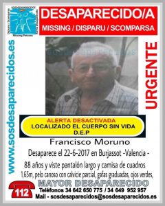 La familia de Francisco Moruno, un vecino de Burjassot de 88 años, desapareció este jueves de su domicilio ha confirmado la aparición sin vida del desaparecido. La familia no ha querido dar más explicaciones del tema y simplemente ha dado las gracias a todos aquellos que se han preocupado y ocupado por tratar de localizar […]
