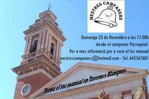 La Asociación Cultural Mestres Campaners de Valencia participara el próximo Domingo dia 23 de noviembre, Solemnidad de Cristo Rey, en el ultimo día de Trisagio y Reserva Solemnisima en la Parroquia de la Santísima Trinidad de la localidad de Tavernes Blanques a partir de las 17:00h, realizando volteo solemnes tanto en la Reserva, Misa Solemne, […]