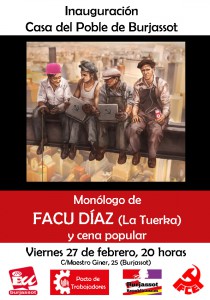 La Casa del Poble de Burjassot abrirá sus puertas el próximo viernes 27 de febrero, a partir de las 20 horas, con un monólogo del humorista político y presentador de La Tuerka, Facu Díaz, y una cena popular para todos los asistentes. El local, situado en el número 25 de la calle Maestro Giner de […]