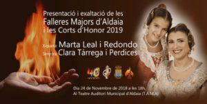 Sábado día 24 de Noviembre a las 18:00 horas, en el Teatro Auditorio Municipal de Aldaia (TAMA), Marta Leal Redondo y Clara Tárrega Perdices serán exaltadas como Falleras Mayores de nuestro pueblo junto con sus Cortes de Honor. En el acto podremos disfrutar de la música y la danza, y nuestras Falleras recibirán sus bandas […]