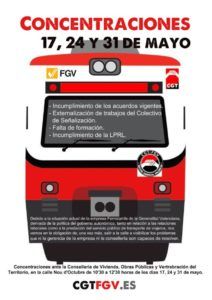 La secció sindical de la Confederació General del Treball en Ferrocarrils de la Generalitat Valenciana (CGT-FGV) ha comunicat a Delegació de Govern concentracions davant la Conselleria d’Habitatge, Obres Públiques i Vertebració del Territori a les 10.30 hores al llarg dels tres pròxims dijous 17, 24 i 31 de maig. Protestes que s’emmarquen en les vagues […]