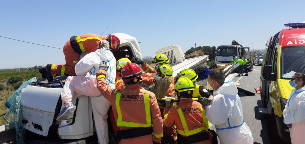 También ha sido alertado el Consorcio Provincial de Bomberos de València, que ha movilizado efectivos y éstos, a su llegada, han procedido a la excarcelación del conductor de uno de los dos camiones que había quedado atrapado en el interior de la cabina.