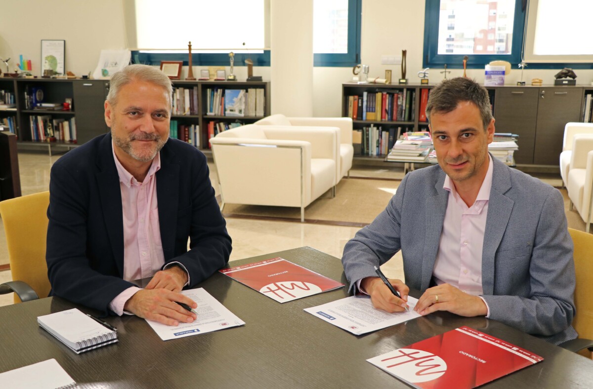El rector de la Universidad Miguel Hernández (UMH) de Elche, Juan José Ruiz, y el consejero delegado de Hidraqua, Jordi Azorín, han firmado esta mañana un convenio. Mediante este acuerdo, ambas entidades colaborarán en el desarrollo de actividades académicas, científicas, tecnológicas y culturales.