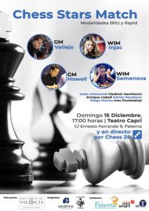 El Club Ajedrez Andreu Paterna, con el apoyo de Diputación de Valencia, organiza el Chess Stars Match, evento que tendrá lugar a partir de las 17 horas del próximo domingo en el Teatro Capri de Paterna, espacio que ha sido cedido por el Ayuntamiento de Paterna. En este escenario se enfrentarán cinco jugadores europeos contra otros cinco con licencia de clubes de la Comunidad Valenciana. Este duelo permitirá a los asistentes contemplar, en directo, las evoluciones sobre el tablero por parte de Grandes Maestros, junto a otros jugadores de primer nivel nacional y jóvenes promesas.