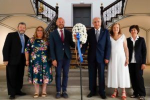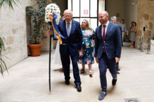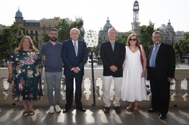 También el President de la Generalitat ha recibido en las puertas del Palau su correspondiente Pomell, que ya luce en la balconada recayente a la plaza de la Virgen. Ximo Puig ha recibido a la comitiva de representantes del Corpus a pie de calle para recibir el tradicional obsequio.