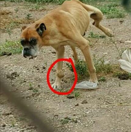 En las fotografías aportadas por los agentes se puede apreciar que el animal está excesivamente delgado y que presenta un bulto de tamaño considerable en una de sus patas delanteras.