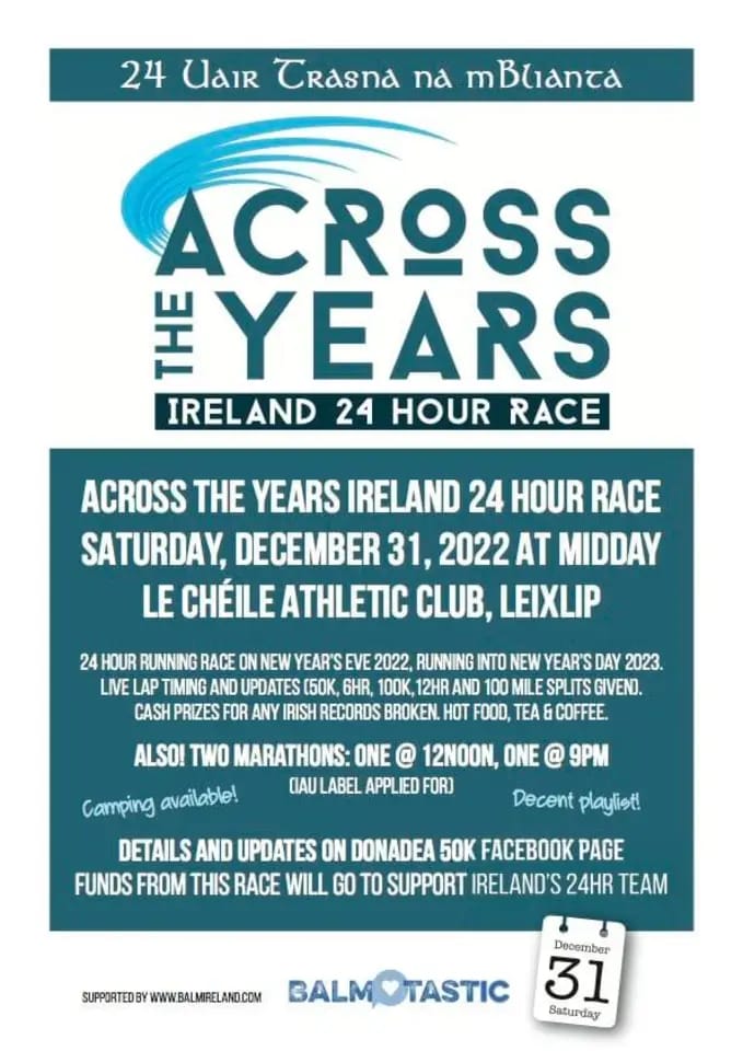 La prueba, que supone la duodécima del valenciano esta temporada, está organizada por la Federación de Ultramaratón de Irlanda y dará comienzo el 31 de diciembre de 2022 a las 12 del mediodía, finalizando el 1 de enero de 2023 en el mismo horario.
