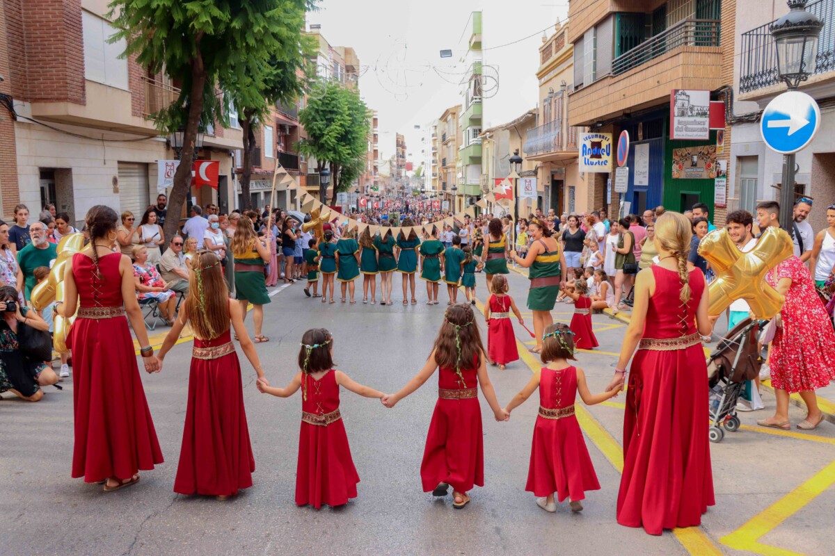 Además, los más pequeños y pequeñas de cada filà y comparsa estuvieron acompañados en el desfile por el capitán moro, Vicent Soler; el capitán cristiano, Nicko Magán; el alférez moro, Eduardo García; y el alférez cristiano, Ramón Almerich.