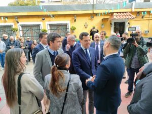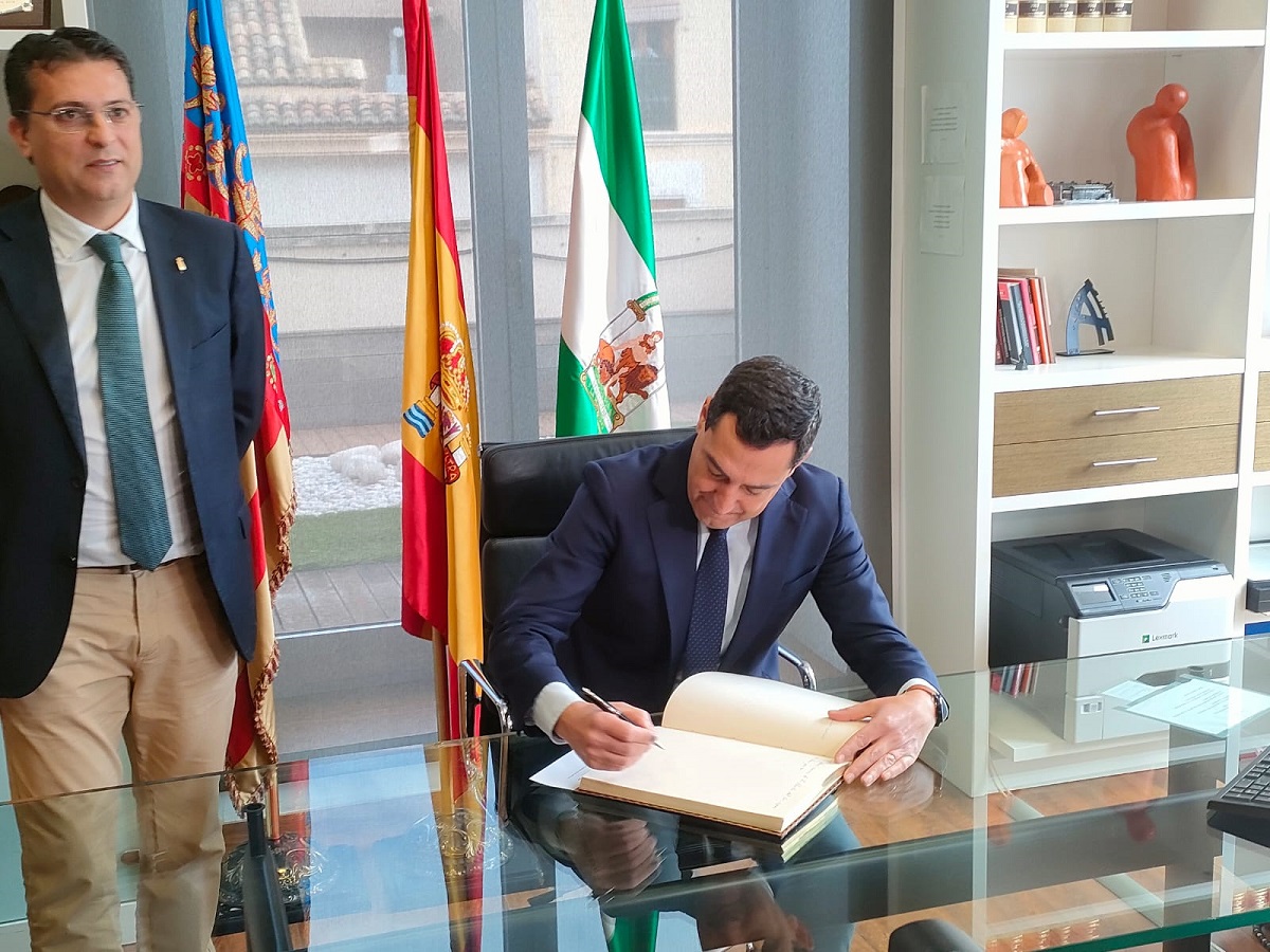 El presidente andaluz, que ha sido recibido por el alcalde de la localidad, Juan Ramón Adsuara, ha podido departir con vecinas y vecinos de la localidad y ha firmado en el libro de honro del Ayuntamiento, junto a representantes de la entidad andaluza.