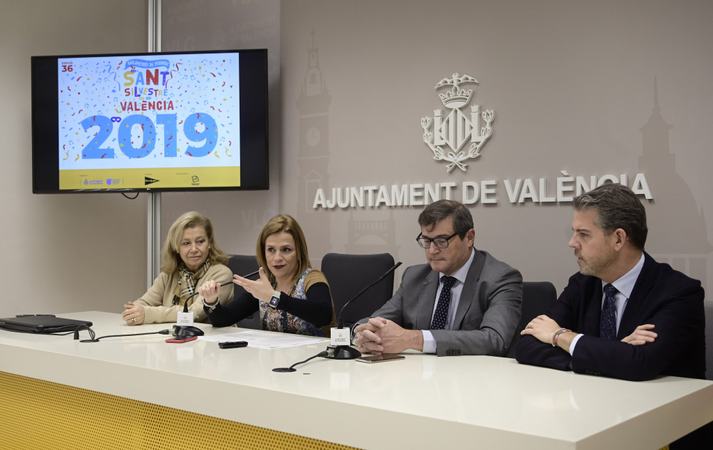 La concejala de Deportes del Ayuntamiento de València, Pilar Bernabé, acompañada del director de Relaciones Externas de El Corte Inglés, Pau Pérez, de la presidenta de AFAV (Asociación de Familiares de Alzheimer València), Ana María Ruiz, y Vicente Sanz, en representación de la SD Correcaminos, ha presentado hoy la 36ª edición de la San Silvestre Popular Valenciana. Una jornada lúdica deportiva que se celebrará el próximo lunes 30 de diciembre, a partir de las 20:00 horas, y en la que 17.400 corredores y corredoras despedirán el 2019 al completar un recorrido de 5,3 Km disfrazados y disfrazadas. La carrera tiene dos modalidades, una competitiva y otra que no, pero idéntico componente solidario, ya que el importe íntegro de las inscripciones se destinará a la AFAV.