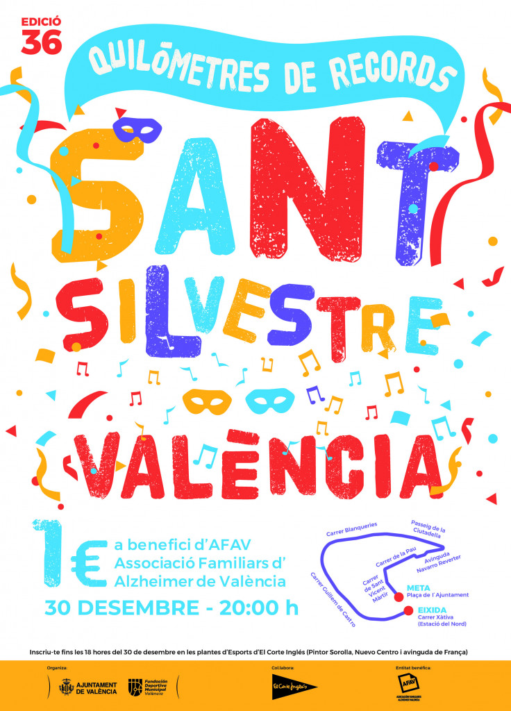 La 36ª edición de la San Silvestre Popular Valenciana, una de las citas más antiguas del atletismo popular en la ciudad y última carrera del año, está dirigida a todos los públicos por su componente “festivo, lúdico, familiar y de amigos”. La consta de un recorrido de 5,3 Km con salida en la Estación del Norte, pasando por Guillem de Castro, Blanquerías, Paseo Ciudadela, Plaza América, Navarro Reverter, Calle de La Paz, y Calle de San Vicente Mártir, hasta alcanzar la meta ubicada en la Plaza del Ayuntamiento.