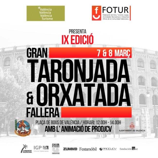 La Federación de Ocio, Turismo y Juego de la Comunitat Valenciana (FOTUR) celebra el 7 y 8 de marzo la novena edición de su 'Horchatada y Naranjada fallera', en la que se reparten en torno a 8000 vasos de horchata y zumo de naranja junto a la Plaza de Toros de València entre las 12 y las 14 horas.