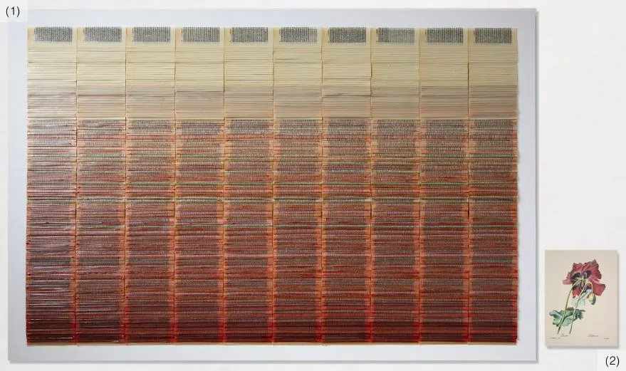 La obra ganadora del premi Senyera d’Arts Visuals 2025, que pasa a formar parte del patrimonio artístico del Ayuntamiento de València, es un conjunto formado por dos elementos conectados por el color: un paisaje elaborado con las páginas de 6 ejemplares de “El Castillo” de Kafka, y la imagen de una Papaver Somniferum (amapola del opio) impresa sobre papel.