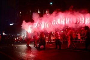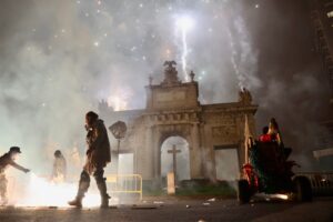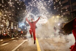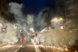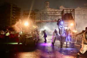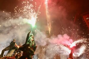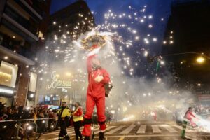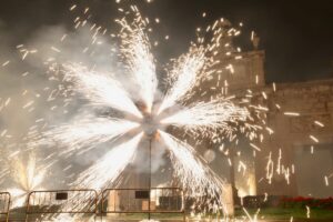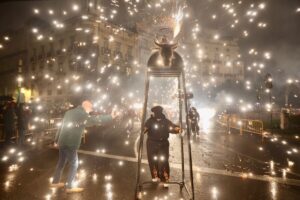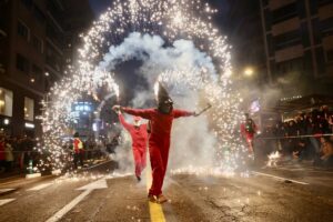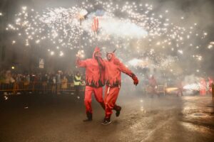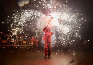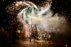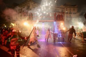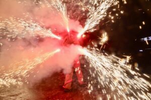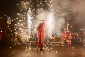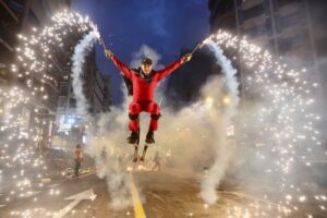 A continuación, una serie de espectáculos de fuego llenaron la tarde-noche del centro de Valencia de piruetas, pólvora, color y sonido con 'Dimonis Xe que guay' de Fontanar dels Aforins, 'Dimonis Socarrats' de Campanar, 'Dimonis de Lavern' de Alboraya, 'Dimonis enroscats' de l'Alcúdia, Dimonis de Massalfassar, Pyors SL, vehículos buggies, Dimonis de Mislata y la Escuela de percusión Borumbaia.