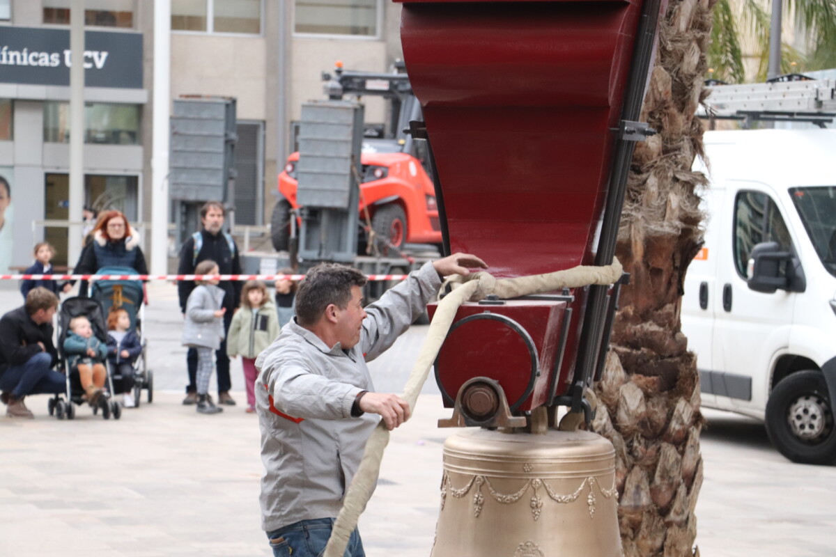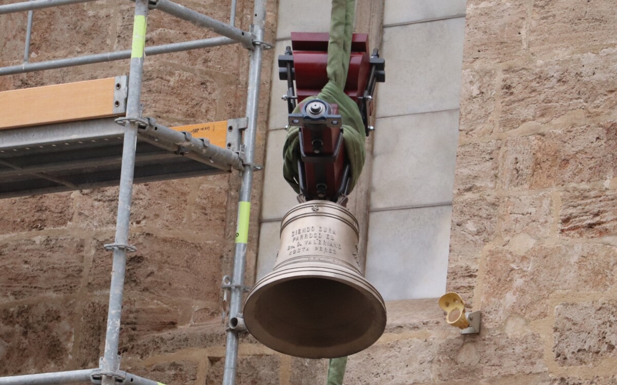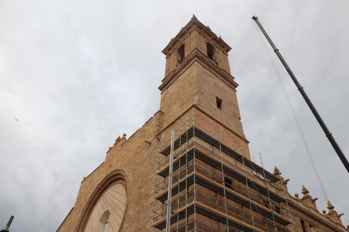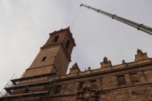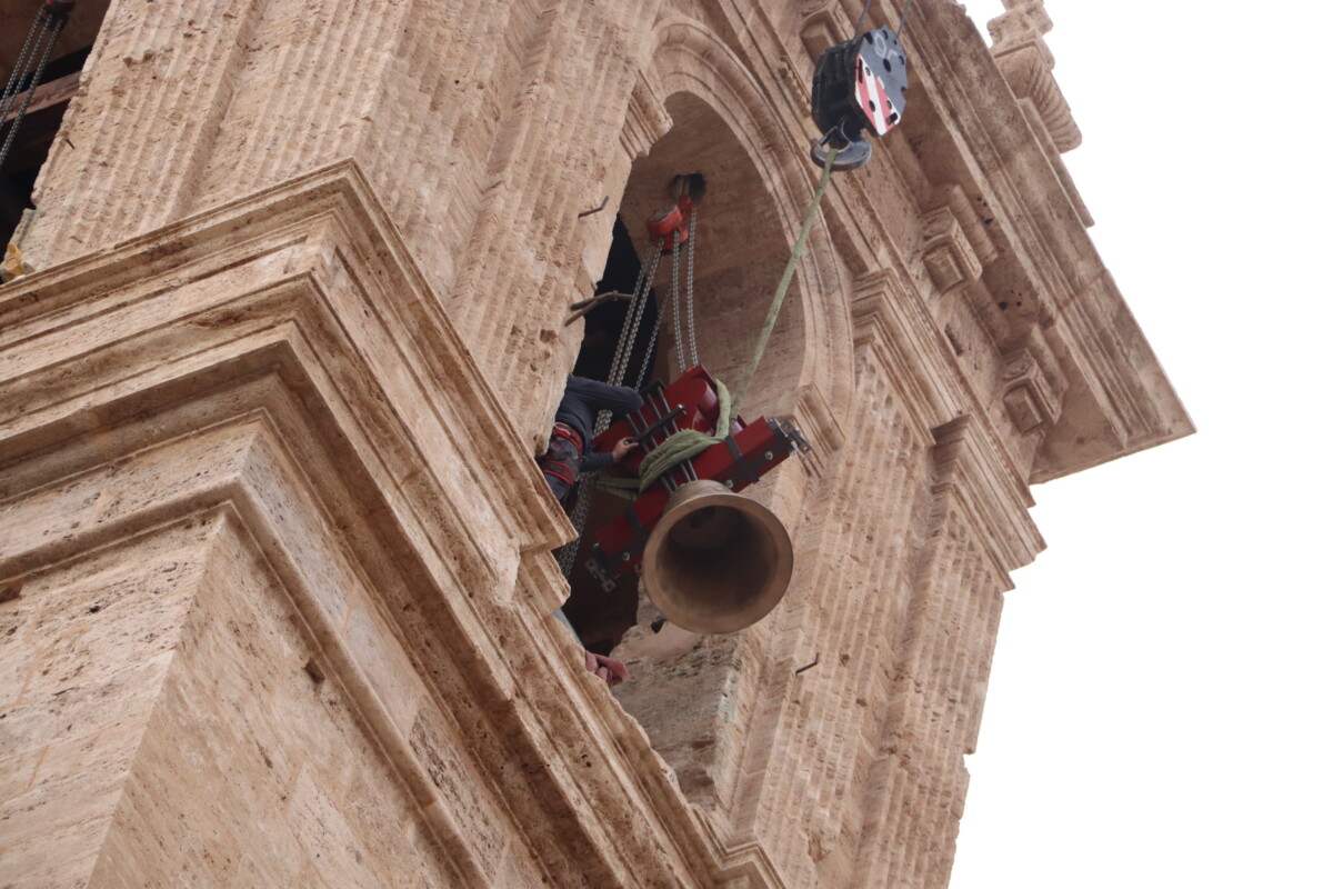 Este miércoles, a partir de las 15 horas, 'El Borrego' y el resto de campanas de los Santos Juanes han sido subidas con una grúa al campanario de la céntrica iglesia valenciana en la que, desde junio de 2021 se está realizando una intervención general gracias a la Fundación Hortensia Herrero.