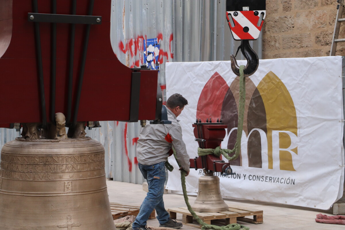 De las siete campanas del conjunto se han restaurado cinco porque dos, ´María` y ´Pere`, ya fueron restauradas en 2006. Los trabajos han consistido en “la limpieza de los bronces, poner nuevos contrapesos de madera, copia de los originales del siglo XIII, y el arreglo del reloj, a cargo de la Hermandad de Sant Joan del Mercat”, señalan los campaneros.