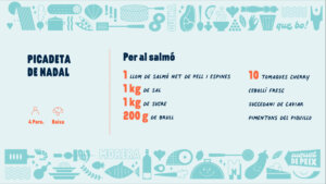- Ingredients salmó: 1 llom de salmó net de pell i espines, 1 quilo de sal, 1 quilo de sucre, 200 g de brull, 10 tomaques cherry, cebollí, succedani de caviar, pimentons de piquillo, pell d'una taronja i d'una llima, anet sec, pebre negre en gra i oli d'oliva verge extra.