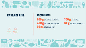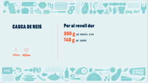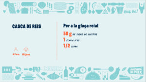 - Ingredients: 500 g d'ametla molta fina, 400 g de sucre de llustre, 30 ml de clares d'ou, 100 g de glucosa, 60 g de sucre invertida (líquida). Per al rovell dur: 200 g de rovell d'ou, 140 g de sucre. Per a la glaça reial: 50 g de sucre de llustre, 1 clara d'ou i ½ llima.