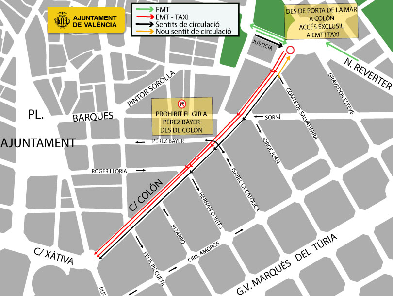 Igualmente está prevista la reorganización de la circulación en la calle Colon para garantizar un servicio de calidad a los viajeros de la EMT. Por eso, se creará un doble carril segregado de uso exclusivo para el transporte público -autobuses de la EMT y taxis- y se mantendrá otro de circulación para los vehículos motorizados privados. Así, se facilitará la circulación del transporte público con un aumento de la oferta cuando por Colón circulen 9 líneas de autobús de la EMT en lugar de las 5 actuales, y el número de autobuses pase de 500 a 850 diarios. Grezzi ha recordado que esta decisión también se enmarca en el objetivo de humanizar la calle Colón después de que la ciudadanía decidiera en el proceso participativo #DecidimValència 2019 que se elaborara un estudio para reducir el tráfico motorizado ampliando espacios de calidad en esta calle.
