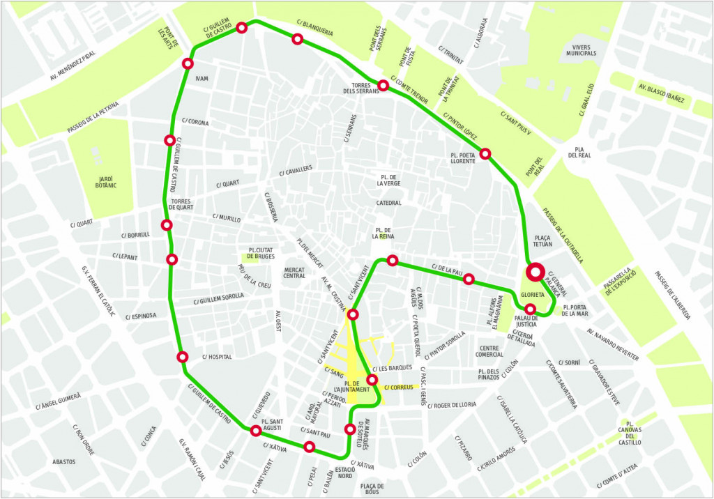 Se modifica la línea 4, que pasaba por la plaza del Ayuntamiento y ahora pasará por Poeta Querol, mientras que las líneas 6 y 31 continuarán pasando por Poeta Querol, sin cambios. En cuanto a las líneas que pasaban por la plaza del Ayuntamiento y ahora pasarán por Colón, la 8, 11, 70 y 71 pasaban por la calle de la Pau y ahora irán por Colón, al igual que la línea 10, que pasa por la calle Correos y ahora discurrirá por Colón.