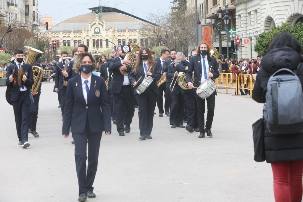 pEste domingo 26 de febrero las bandas participantes se han reunido en la plaza Tetuán, a las 11.00 horas, comenzando la entrada a las 11:30 horas, en el siguiente orden: 1º Escuela de Tabal i Dolçaina de Junta Central Fallera; 2º, Agrupación Musical San José de Pignatelli; 3º, Agrupación Musical Santa Cecilia del Grao; 4º, A. C. Falla Jerónima Galés Litógrafo Pascual i Abad; 5º, Sociedad Ateneo Musical del Puerto; 6º, Banda de Música de Campanar; 7º, Centro de Música y Danza de Nazaret; 8º, Centro Instructivo Musical Banda de Torrefiel; 9º, Centro Instructivo Musical de Benimaclet; 10º, Centro Instructivo Musical de Castellar-Oliveral; 11º, Centro Instructivo Musical Tendetes; 12º, Unión Musical de Benimodo; 13º, Agrupación Musical Santa Cecilia de Sedaví.