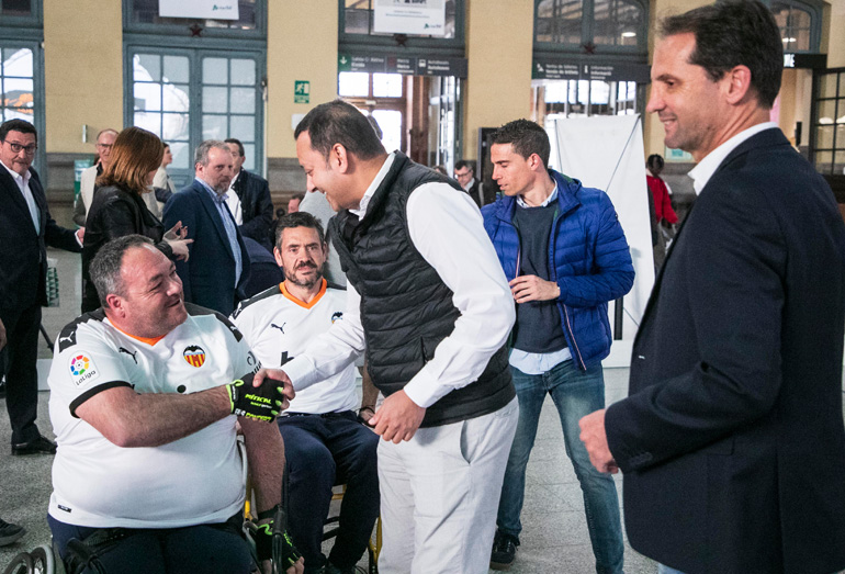 Al acto, que se ha prolongado por espacio de hora y media, han acudido Mónica Oltra, vicepresidenta de la Generalitat Valenciana; Anil Murthy, presidente del Valencia CF, José Luis Zaragosí, consejero del Valencia CF; Josep Miquel Moya, director general de Deportes y Mª José Catalá, concejala del Ayuntamiento de Valencia, así como decenas de viajeros, curiosos y aficionados que han disfrutado con las evoluciones de los jugadores de la Escuela de Fútbol formada por la Asociación de Futbolistas en colaboración con el Valencia CF, la AFAE (Asociación para el Fomento del Fútbol en Silla de Ruedas) y la Universidad de Valencia.