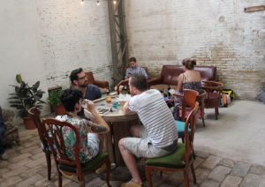 La banda sonora del evento la pone un servicio de DJ o pinchadiscos -elíjase lo que proceda dependiendo del estado de ánimo del local en cada momento- y el puntito de sabor, la barra de bar que nos devuelve la sana costumbre del aperitivo valenciano, bien con cerveza, bien con cacaos, tramusos o mejores y mayores viandas.