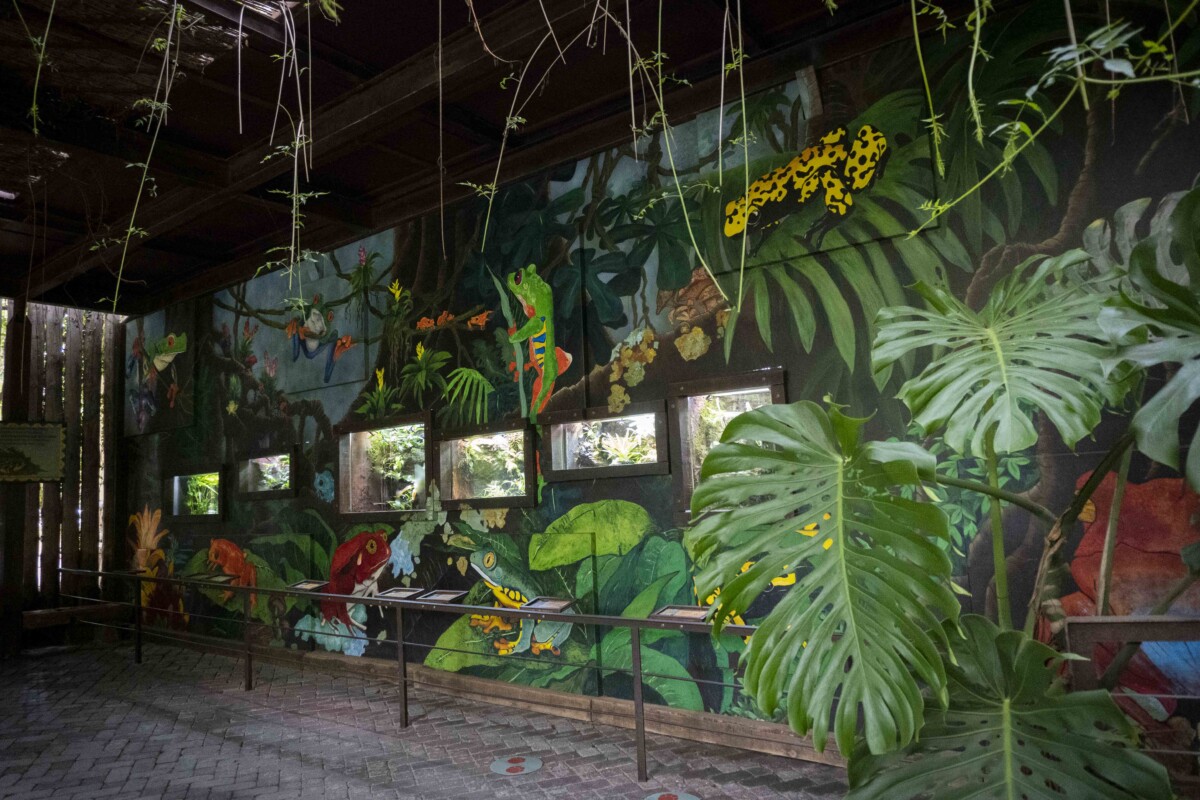 Los anfibios son especialmente sensibles al deterioro del medioambiente, un “termómetro” de la salud de los ecosistemas. Al mismo tiempo son imprescindibles para el equilibrio natural de los frágiles humedales donde habitan. Desde Bioparc se ha querido llamar la atención sobre ellos y en la zona que recrea la Cueva de Kitum se encuentra un maravilloso mural, una obra de arte, que esconde diferentes terrarios. Allí podemos contemplar especies tan impresionantes como la rana tomate, la rana dorada, la rana veneno de flecha o el gallipato, también conocido como ofegabous.