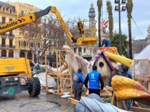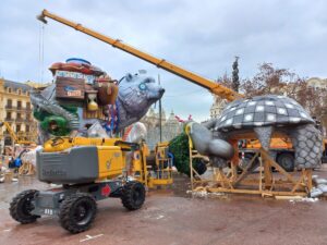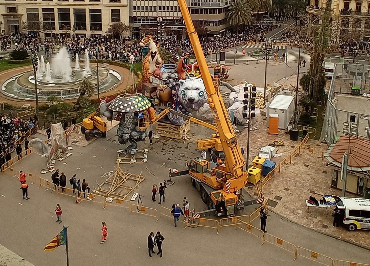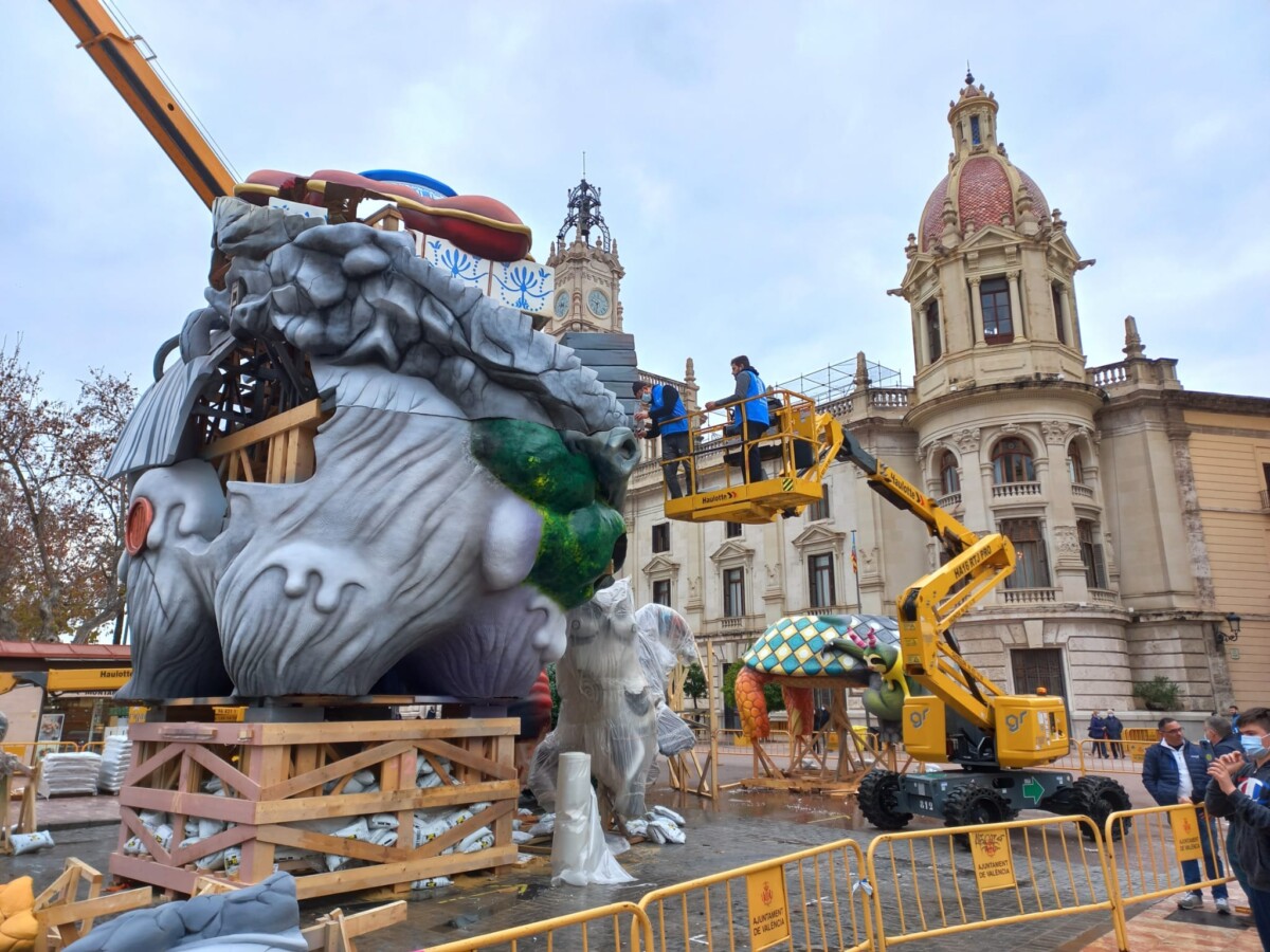 El artista fallero Alejandro Santaeulàlia ha empezado la plantà de la falla municipal de Valencia 2022, que este año lleva por título 'Protege lo que quieres' y está dedicada a la concienciación medioambiental. Pasado el episodio de lluvias, ya se han retirado los plásticos que cubrían el monumento y la grúa empieza a elevar la pieza central.