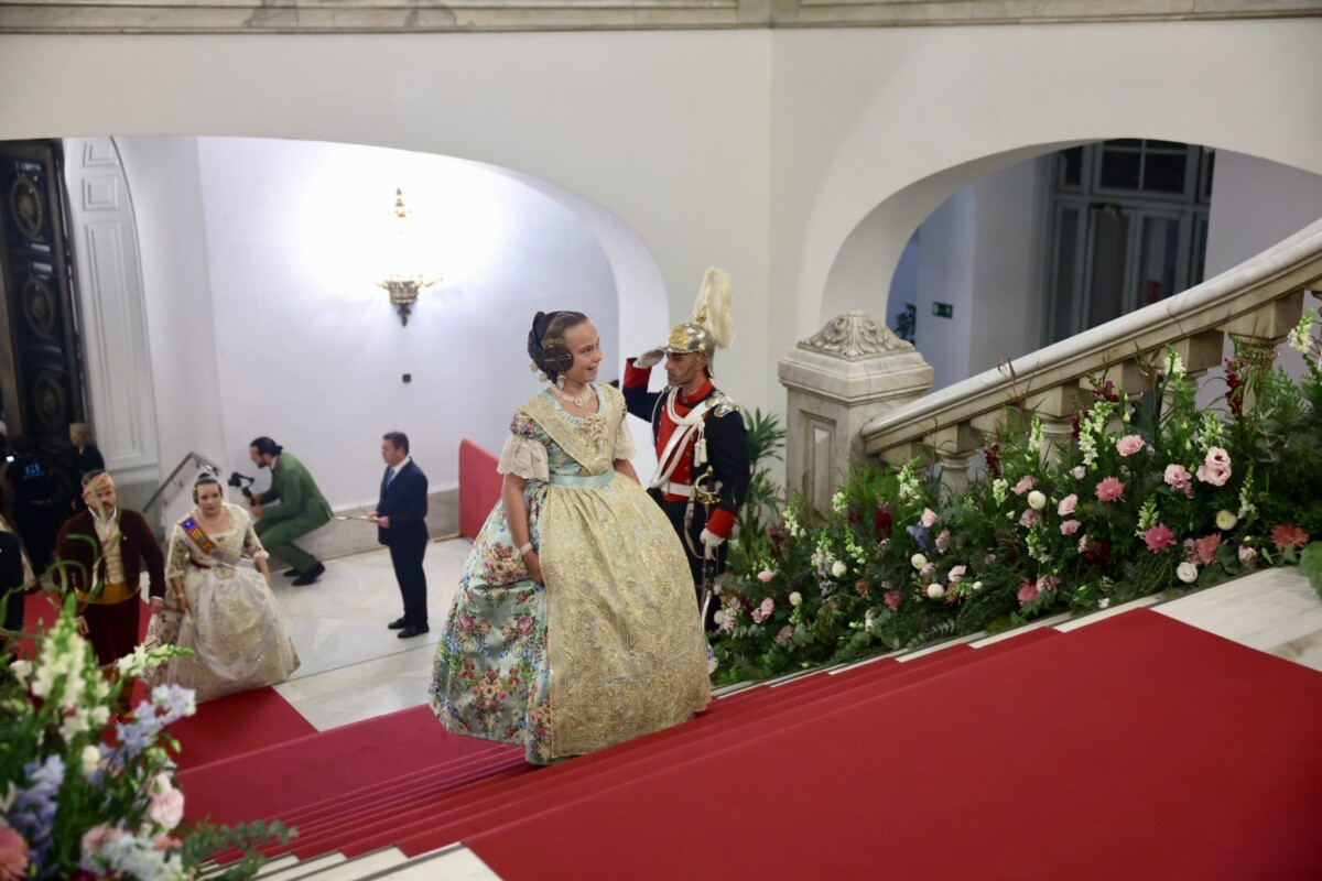 Las falleras mayores y sus cortes de honor han llegado al Ayuntamiento de València sobre las 19:10 horas, vestidas de azul (Lucía) y verde (Berta), entre aplausos y música, y han sido recibidas por la alcaldesa, María José Catalá.