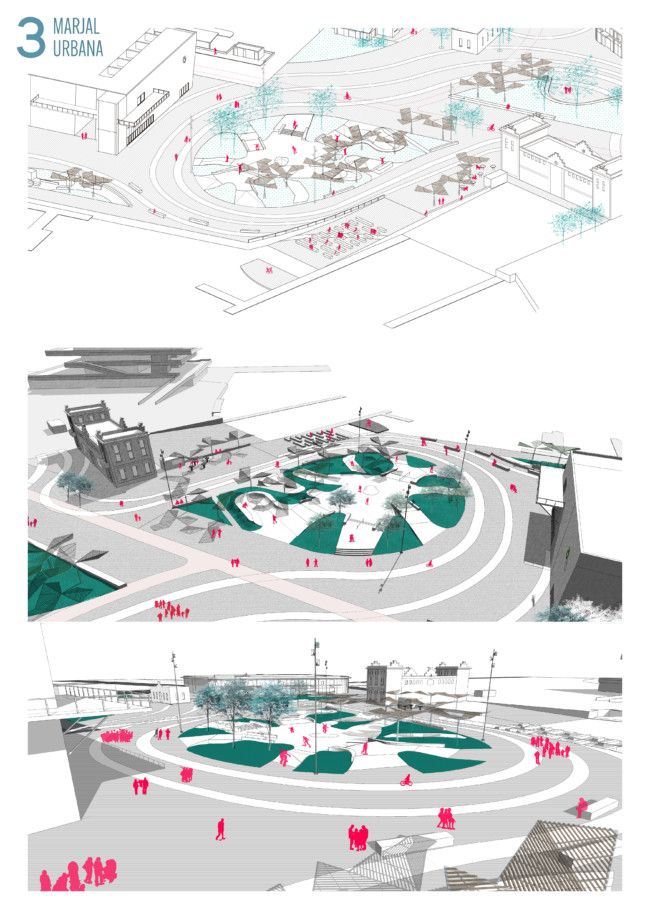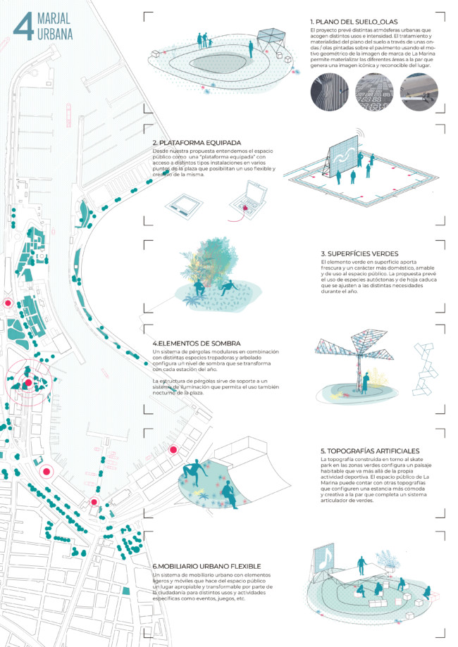 La propuesta 'Marjal urbana' se caracteriza por su diseño singular y creativo, integrado con el paisaje y que respeta los accesos ciclistas y peatonales. La plaza se organiza a partir de unas ondas que guían los recorridos naturales e hilan los edificios y el interior de la dársena. A modo de islas, se introducen espacios verdes y se crean sombras a través de pérgolas. El skatepark es el elemento central alrededor del cual se articulan distintos usos y situaciones y se ubican otros elementos como un auditorio, un quiosco, un mirador y mobiliario urbano transformable.