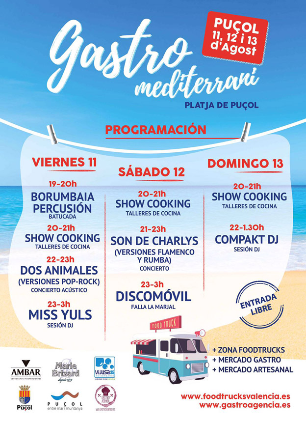 La playa de Puçol se llenará de food trucks, mercados y muchos otros planes para mayores y pequeños los días 11, 12 y 13 de agosto, durante la celebración de la feria gastronómica Gastromediterrani. Además, la música más diversa no faltará en un espacio que contará con talleres de cocina y otras actividades.