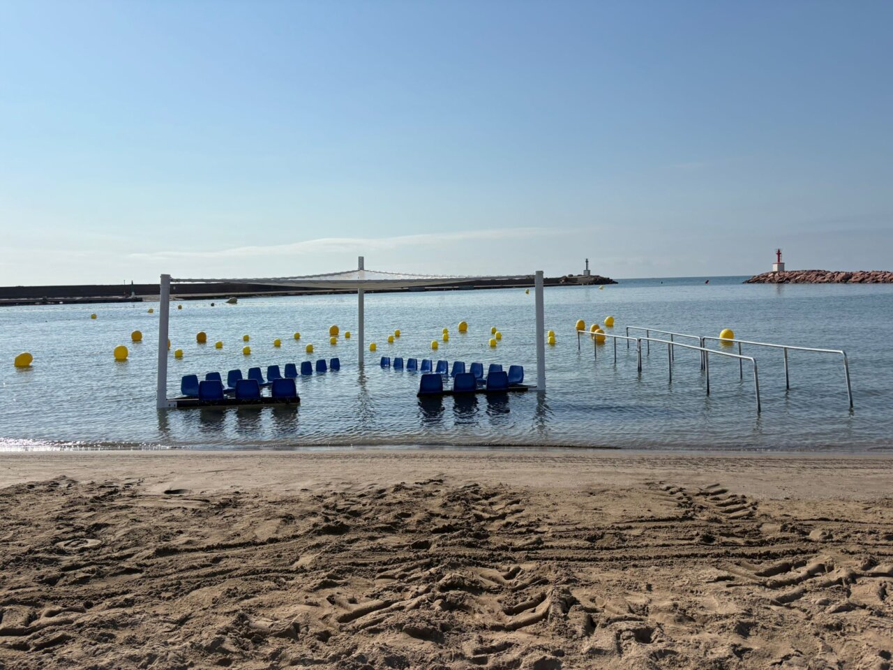 La zona de baño accesible se sitúa dentro del mar, a unos 0,5 metros de profundidad, e incorpora una estructura triangular de sombra, asientos fijos de polietileno, barandillas de acero inoxidable para el acceso y dos canales de nado delimitados por corcheras. Todo el conjunto queda balizado con boyas rígidas para garantizar la seguridad y el uso exclusivo.