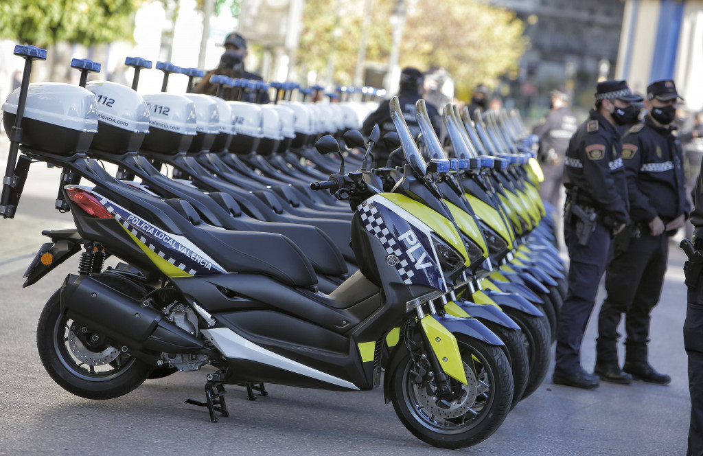 El concejal de Policía Local de València, Aarón Cano, ha presentado en la Plaza del Ajuntament 20 nuevas motocicletas de la PLV, que van a reforzar las tareas de la Policía de Proximidad, en un acto en el que también ha participado el Comisario Jefe del Cuerpo, Jose Vicente Herrera. Según el concejal “todas las motos van para los distritos, ninguna es para las unidades centralizadas, tres para cada unidad de distrito y dos para la zona centro”.