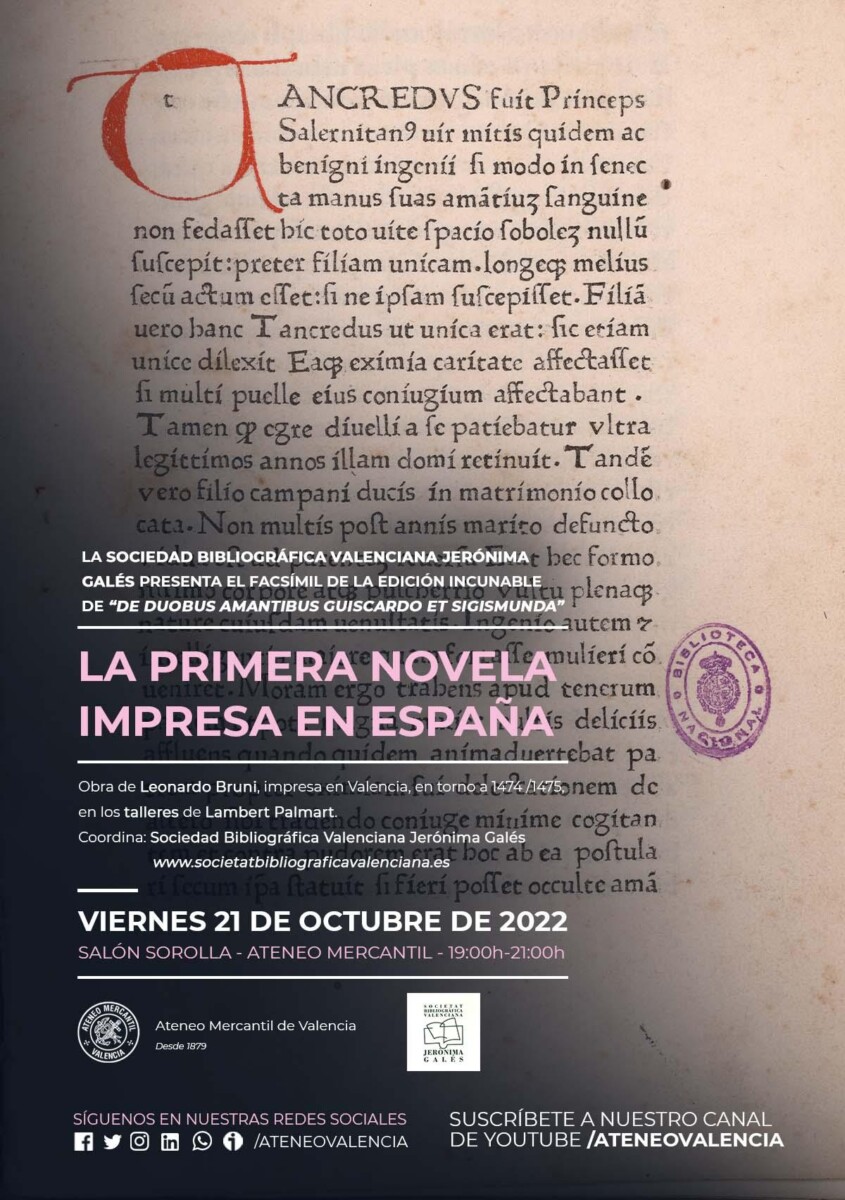 La Sociedad Bibliográfica Valenciana Jerónima Galés uno de cuyos fines primordiales es la publicación con sus propios medios de esmeradas ediciones de obras raras, de difícil localización o de contenido interesante y que probablemente nunca serian conocidas por la sociedad valenciana, presenta mañana 21 de octubre a las 19.00 h, en el Salón Sorolla del Ateneo Mercantil de Valencia, la edición facsímil del incunable 'De duobus amantibus Guiscardo et Sigismonda', —primera novela impresa en España, en Valencia, por Lambert Palmart en torno a 1474/75—. Se trata de la versión latina del primer cuento de la cuarta jornada del Decamerón, obra de Leonardo Bruni de Arezzo, cuyo original se conserva formando parte de un volumen facticio en la Biblioteca Nacional de España.
