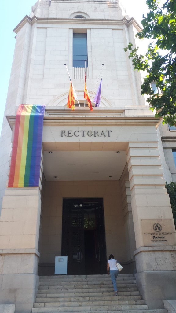 La Universitat de València, a través de Diversitats, se suma a la celebración del Orgullo para visibilizar e impulsar las acciones de inclusión de toda la diversidad que existe en la comunidad universitaria y contribuir así a la superación de discriminaciones y estereotipos. Por eso, la bandera LGTBI ondeará también este año en los edificios del Rectorado, del Centre Cultural La Nau y en el edificio histórico del campus de Ontinyent. La vicerectora de Igualdad, Diversidad y Sostenibilidad, Elena Martínez, anima a la comunidad universitaria a sumarse a los actos organizados con motivo de esta celebración e invita al estudiantado, PAS y PDI a ser centro activo de este Orgullo Universitario.