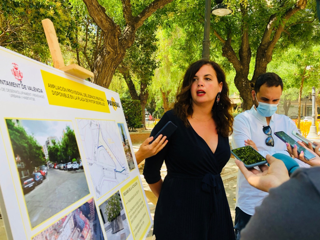 La vicealcaldesa y concejala de Desarrollo y Renovación Urbana del Ayuntamiento de València, Sandra Gómez, ha visitado las obras de peatonalización de la plaza Pintor Segrelles junto con el concejal de Emergencia Climática y Transición Ecológica, Alejandro Ramón, donde se está llevando a cabo una actuación provisional para convertir esta zona en una plaza que contará con 1.800 m2 de uso peatonal.