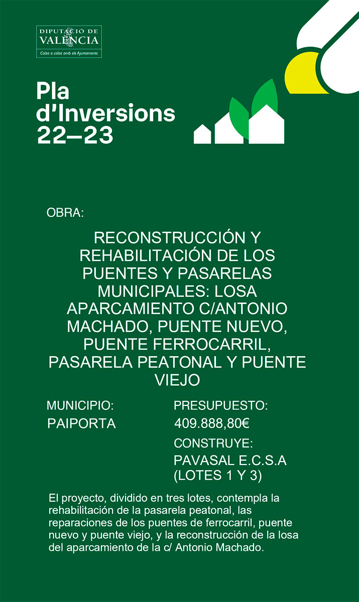 El pasado mes de marzo dieron comienzo los trabajos correspondientes al lote 3 de la reconstrucción y rehabilitación de los puentes y pasarelas municipales de Paiporta, proyecto que cuenta con un presupuesto de 409.888.80 €, subvencionado por el Pla d’Inversions 22-23 de la Diputació de València.