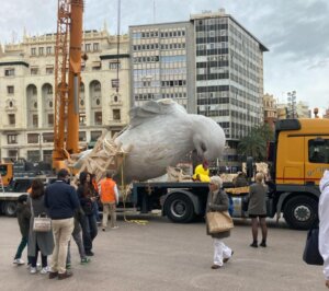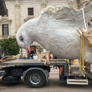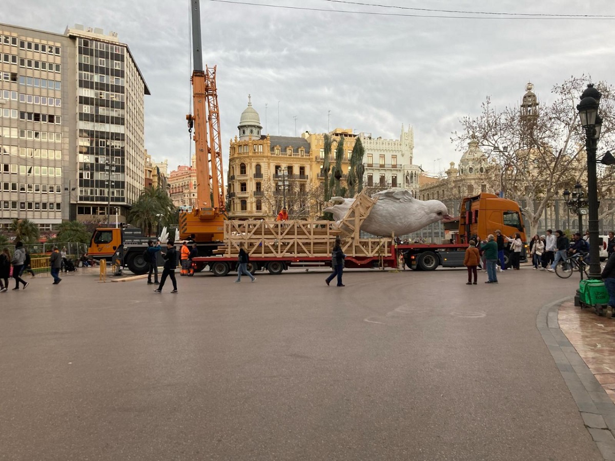 La falla municipal de Valencia, 'Dos palomas, una rama', de Escif y Pere Baenas, empieza a tomar forma. Precisamente dos enormes palomas llegaron este lunes a la plaza del Ayuntamiento inaugurando así la semana de montaje previa a la plantà de las fallas de Especial y Primera A. El resto de categoría comenzarán a plantar en dos días.