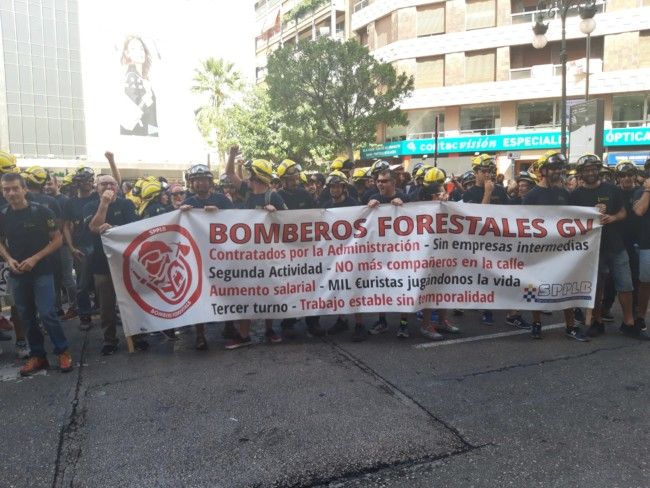 Más de un centenar de bomberos forestales se han concentrado este mediodía frente a la sede de Delegación del Gobierno en la Comunitat Valenciana, cortando la céntrica calle de Colón de València, para protestar por la situación del colectivo, mientras sus responsable sindicales se reunían con el mismo delegado del Gobierno, Juan Carlos Fulgencio.