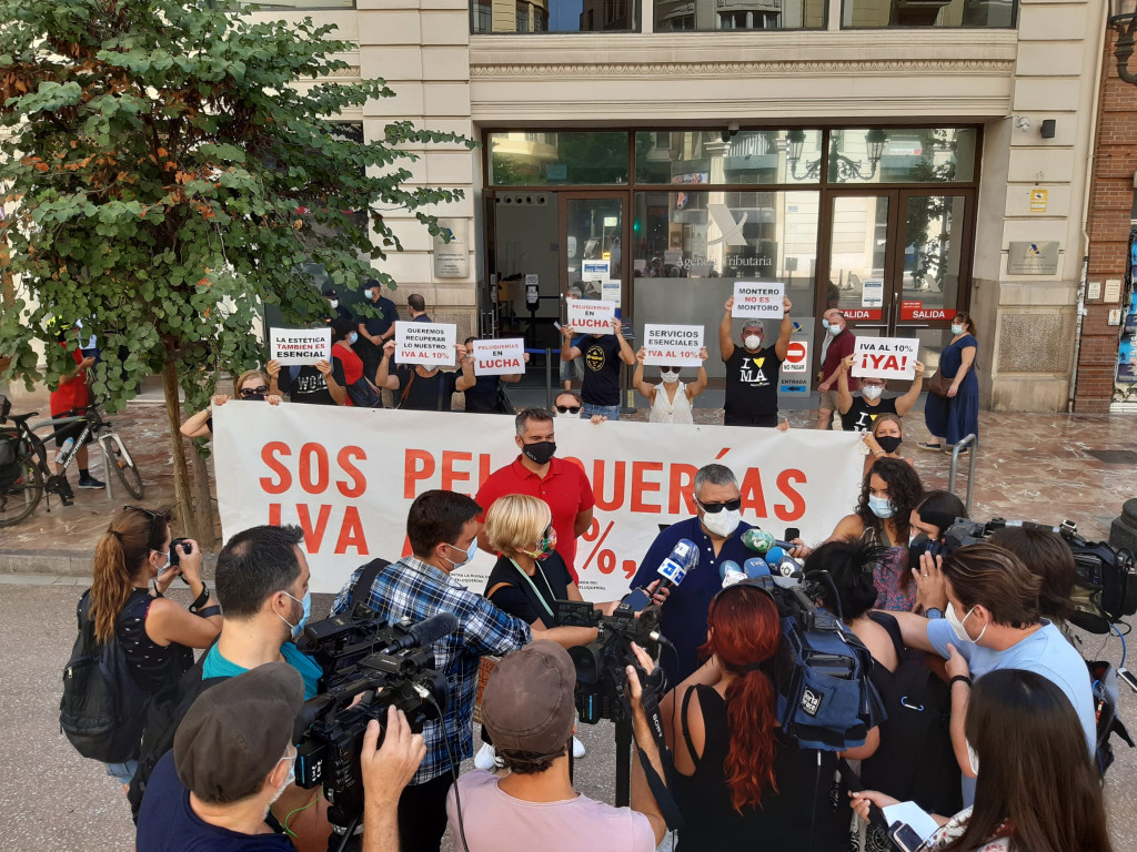 Los colectivos y empresas valencianas, integrados en la Alianza, se han concentrado a las puertas de la sede principal de la Agencia Tributaria, representados por Paco Fortea, presidente del Gremio Provincial de Peluquería de Valencia. Con pancartas, con el lema principal "¡¡¡SOS peluquerías, IVA al 10%, ¡¡¡YA!!!" y mensajes de “Peluquerías en lucha”, “Queremos recuperar lo nuestro: IVA al 10% ya” o “Montero no es Montoro”, han justificado su reivindicación subrayando que “ la lucha por la recuperación del tipo de IVA reducido al 10 % “es una cuestión de justicia, ya que el sector de la imagen personal es un servicio esencial y de primera necesidad”.