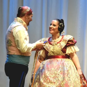 Una vez llegados a este punto se pasó a la parte protocolaria donde las falleras mayores de la ciudad, María Saura Botet y Carina Lellig Alfonso, recibieron su máxima distinción, sus bandas de falleras mayores junto con la joia de la junta local fallera de Manises.