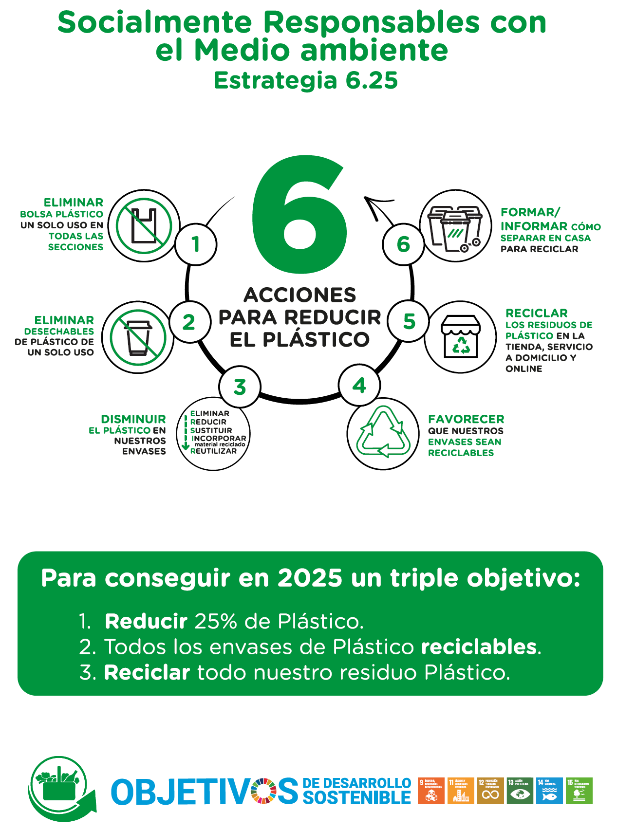 La Estrategia 6.25, que tiene el triple objetivo para 2025 de reducir un 25 % el plástico, hacer todos los envases reciclables y reciclar todos los residuos plásticos, se está llevando a cabo a través de 6 acciones que implican cambios en diferentes procesos de la compañía, desde la definición de los envases del futuro, a la coordinación con los proveedores, la adaptación de las tiendas, la gestión de residuos, la logística, etc.