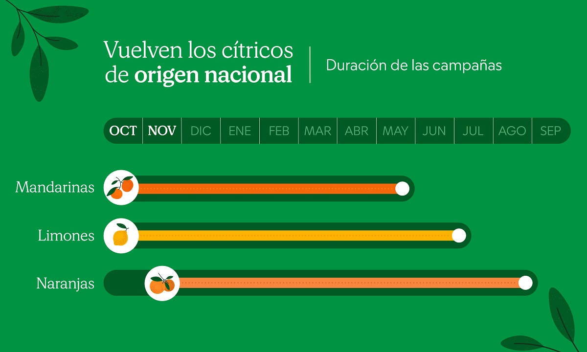 Mercadona, compañía de supermercados físicos y de venta online, inicia la campaña 2023/24 de cítricos de origen nacional con una previsión de compra de 220.000 toneladas, cifra que supone un incremento del 10% respecto a la campaña anterior. La nueva campaña arranca en octubre con la llegada de la mandarina y el limón origen España, y a inicios de noviembre entrará la naranja nacional progresivamente en las tiendas de la cadena.